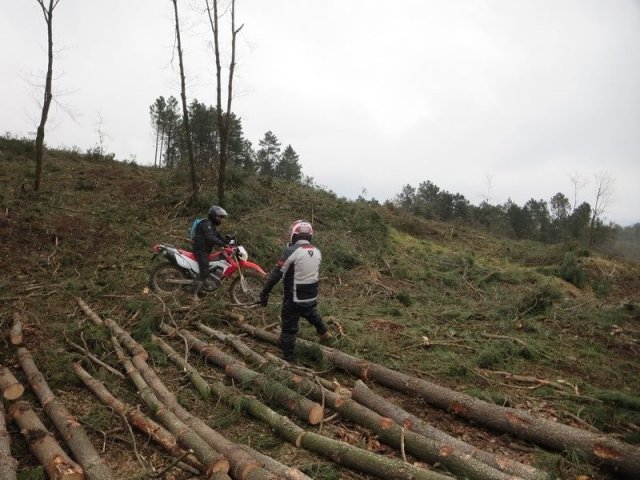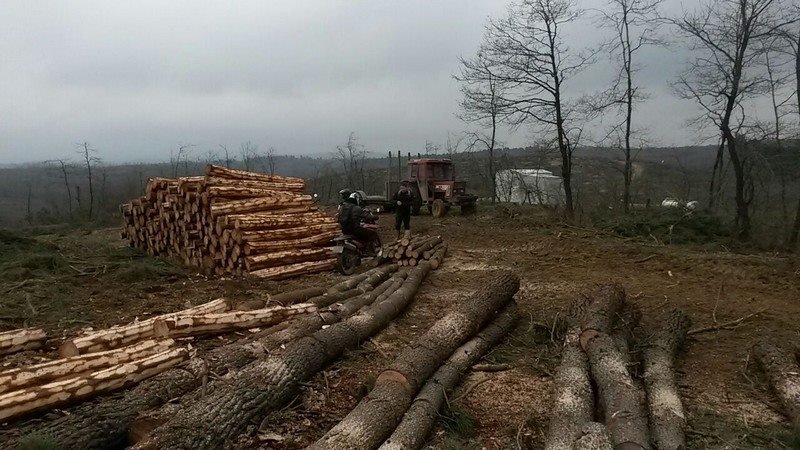 Yer yer ağaç kesimleri var, işçilerin arasından geçiyoruz ve nihayetinde ağaçların yolu kapattığı bir noktaya geliyoruz, etrafından dolanarak ilerliyoruz.