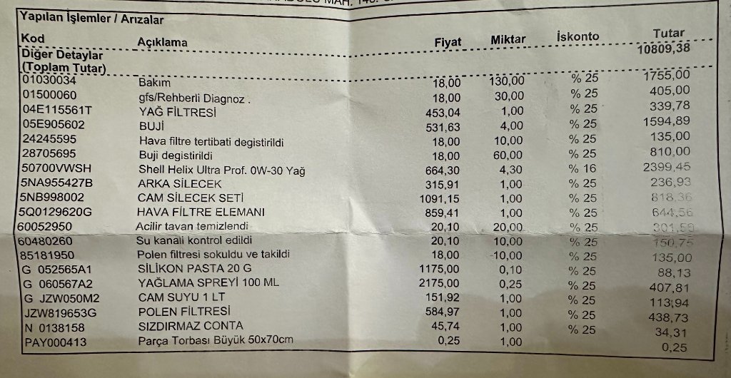 H.Cenk Bayrakçı 28 Mayıs 2024 Yazar Paylaş 28 Mayıs 2024 (düzenlendi) Bugün 4. bakımı (yıllık bakım) yaptırdım. 34230 km olmuş araç. Yetkili serviste Isparta Başaran Oto'da yapıldı. Yağ, yağ filtresi, bujiler, hava filteri ve teribatı, silecekler, polen filtresi değişti, cam suyu eklendi, start stop arızası için yazılım güncellenmesi yapıldı, açılır cam tavan kanalları, su kanalları kontorl edildi, temizlendi ve yağlandı. Park halindeki sürtmeden kaynaklanan çizikler giderildi ve rütuş yapıldı. Toplamda 12971, 27 TL tuttu (KDV Dahil). Detaylar aşağıda... 28 Mayıs 2024 tarihinde H.Cenk Bayrakçı tarafından düzenlendi 4 Yorum bağlantısı
