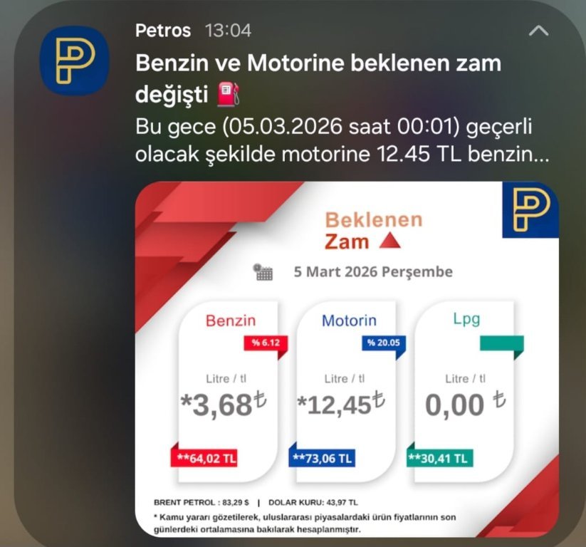 Aydın Sert 20 saat önce Paylaş 20 saat önce (düzenlendi) Kaynak: https://uzmanpara.milliyet.com.tr/uzmanpara/benzin-motorine-zam-geliyor-abd-iran-saldirilari-sonrasi-akaryakita-zam-haberi-geldi-gece-yarisi-tabelalar-degisiyor-7547769 20 saat önce tarihinde Aydın Sert tarafından düzenlendi Metin düzeltme Yorum bağlantısı