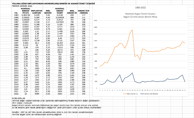 Mehmet Göktürk 9 Mart 2022 Paylaş 9 Mart 2022 YILLARA GÖRE ENFLASYONDAN ARINDIRILMIŞ BENZİN VE ASGARİ ÜCRET İLİŞKİSİ Mehmet Göktürk 2022 YIL NOMİNAL BENZIN FİYATI ENFLASYON ÇARPANI REEL BENZİN NONİMAL ASGARI ÜCRET REEL ASGARİ ÜC ASGARI ÜCR /BENZIN 1983 0,000138 0,035 3,94 0,0162 635 117 1984 0,00022 0,049 4,49 0,024525 686 111 1985 0,00028 0,074 3,78 0,0414 767 148 1987 0,0003 0,136 2,21 0,07425 749 248 1989 0,0011 0,348 3,16 0,225 886 205 1990 0,0024 0,557 4,31 0,414 1019 173 1991 0,0043 0,903 4,76 0,801 1216 186 1992 0,005 1,61 3,11 1,449 1234 290 1993 0,0063 2,58 2,44 2,497 1327 396 1994 0,0238 4,37 5,45 4,173 1309 175 1995 0,0278 9,87 2,82 8,46 1175 304 1996 0,0517 17,58 2,94 17,01 1327 329 1997 0,093 30,1 3,09 35,437 1614 381 1998 0,172 62 2,77 78,075 1726 454 2000 0,58 174 3,33 118,8 936 205 2001 1 236 4,24 167,9 975 168 2002 1,61 410 3,93 250,8 839 156 2005 2,56 627 4,08 531 1161 207 2006 3,08 676 4,56 562 1140 182 2007 2,89 742 3,89 585 1081 202 2008 3,21 803 4,00 638 1089 199 2009 3,15 881 3,58 693 1078 220 2010 3,75 953 3,93 760 1093 203 2011 4,1 1000 4,10 796 1091 194 2012 4,30 1106 3,89 886 1098 206 2013 4,70 1167 4,03 978 1149 208 2014 4,95 1275 3,88 1071 1152 216 2015 4,29 1371 3,13 1201 1201 280 2016 5,07 1503 3,37 1300 1186 256 2017 5,27 1642 3,21 1404 1172 266 2018 5,98 1843 3,24 1603 1192 268 2019 7,15 2250 3,18 2020 1231 283 2020 6,9 2550 2,71 2324 1249 337 2021 7,24 2811 2,58 2825 1378 390 2022 22 4380 5,02 4253 1331 193 AÇIKLAMALAR reel değer yazılan kolonda yıllar içerisinde sabitleştirilmiş fiyatla benzinin değeri görülecektir. 2011 değeri merkezdir Asgari ücretin benzin reele bölünmesi ise asgari ücretle kaç litre benzin alınıyor onu açıklar. Bu da benzine göre hayat pahalılığının değişimini ücret politikasını yıllar içinde ortaya koymaktadır örneğin: 1987 de 247 litre benzin alınabiliyorken 2014 te 216 litre benzin alınabilmektedir reelasgari ücret ise enflasyondan arınmış değerdir güncelledim tabloyu 5 1 Yorum bağlantısı
