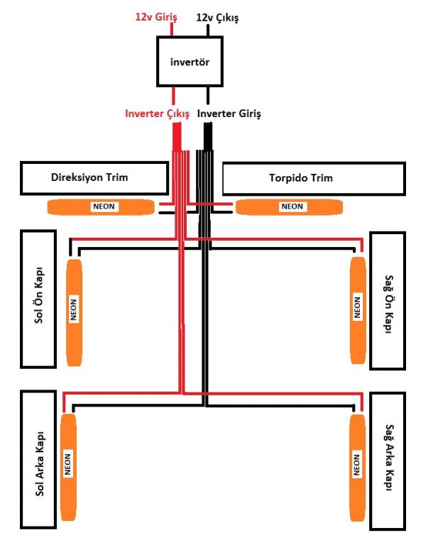 Ali Saruhan 24 Mayıs 2017 Paylaş 24 Mayıs 2017 Konuya noktayı ben koymuşum, hazır mevzu canlanmışken yeni cümleye de ben başlayayım bari [emoji4] Aracımda kapı iç açma kollarına iç ambiyans (parklar) aydınlatmasına bağlı şekilde led montajı yaptım. Parklar yandığında kapı açma kollarındaki ledler de yanıyor. Bununla beraber kapı trimlerine de neon uygulaması yapmak istiyorum. Yine aynı şekilde iç ambiyans (Parklar) ışıklandırmasına bağlı olacak. Daha önce hiç neon uygulaması yapmadım, görmedim, duymadım. Bu nedenle nasıl yapacağımı bilmiyorum, bu birinci sıkıntım. Bununla ilgili videoyu buldum aslında, yukarıda paylaştıklarım. yapabileceğimi düşünüyorum. İkinci sıkıntı ise; 5 metre neon almayı düşünüyorum. Bunu da 4 kapıdaki ve ön göğüsteki her bir trime göre kesip uygulamak istiyorum. Bu durumda da tek invertör ile 4 kapıdaki keseceğim neonları çalıştırabilir miyim? Nasıl? Tek invertör dememin sebebi ise her kapının içine invertör koymak oldukça zor ve gereksiz masraflı olacak. Mesela, sol ön kapı 75 cm diyelim. 75 cm neonu kesip daha sonrasında diğer kapıya nasıl devam ettireceğim ara kablo ile? Aklımda bir sistem var ama doğru olur mu bilmiyorum. 6 parça yaklaşık 50'şer cm uzunluğunda neon kesip aşağıdaki şekilde tek invertöre paralel bağlasam sorun olur mu?neonlar kesilip ek yapılabilir nette videoları var ama yabancı olmasınlazım. sonnolarak araya 7812 bağlayın araç çalışınca 15v geliyor ve ömrü kısalıyor Yorum bağlantısı
